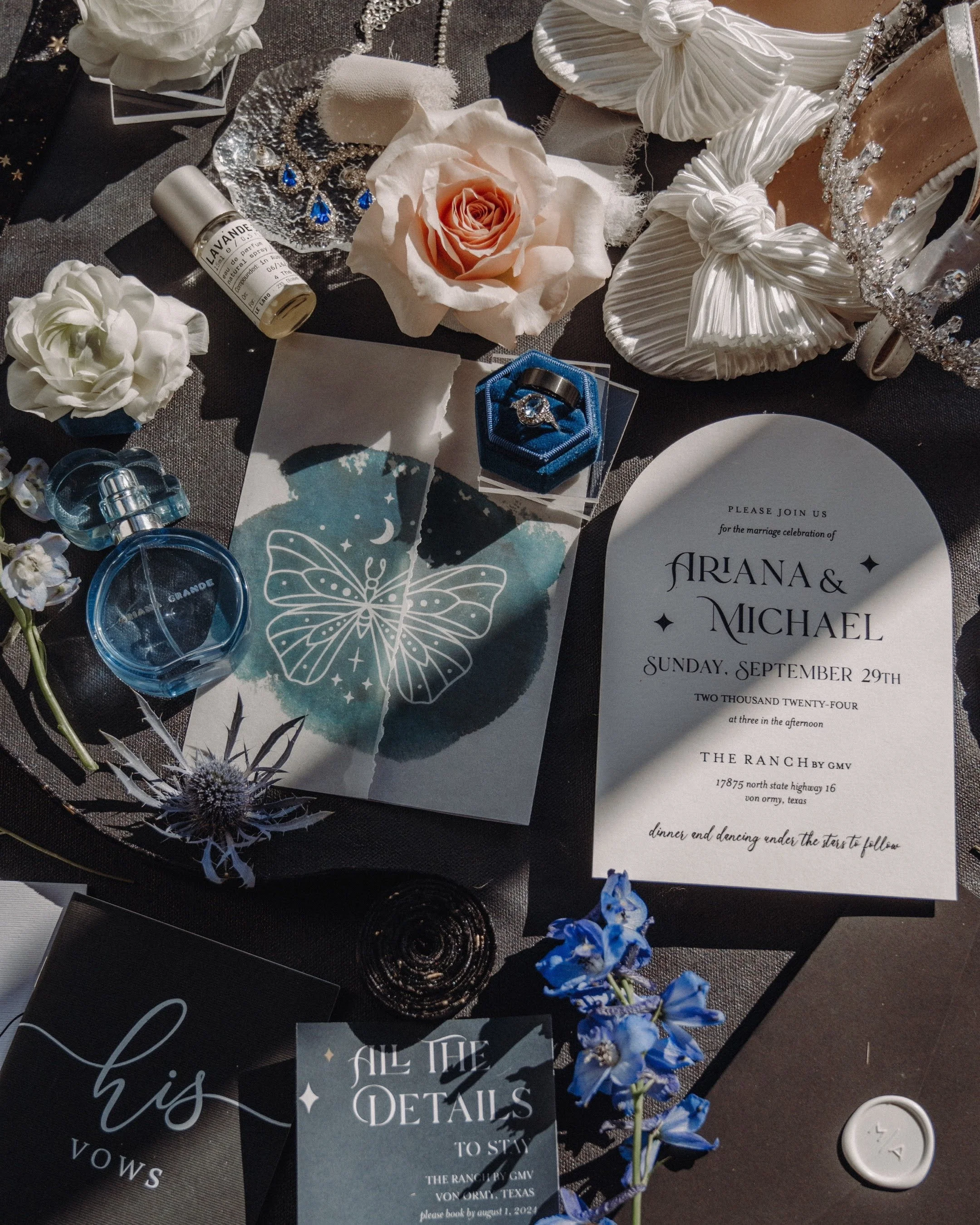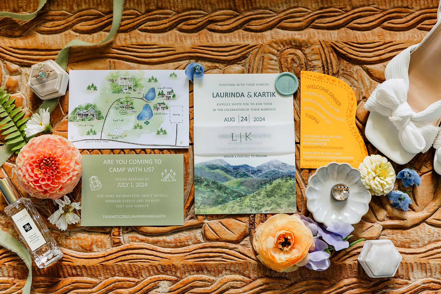 It’s okay to have some things overlap the stationery to be part of the scene, but please don’t cover the wording or important design elements. ESPECIALLY NOT WITH SHOES.